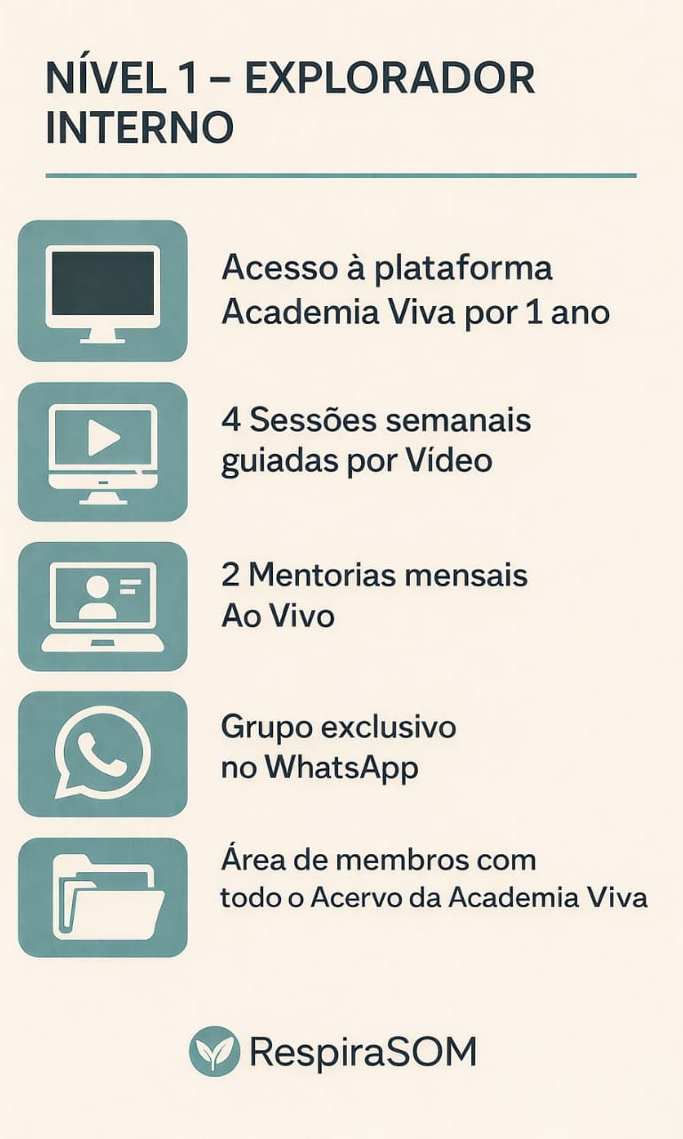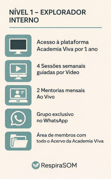 No Nível 1 da Formação RespiraSOM, o módulo Explorador Interno convida o participante a mergulhar profundamente em si mesmo, despertando uma escuta sensível ao corpo e à respiração.